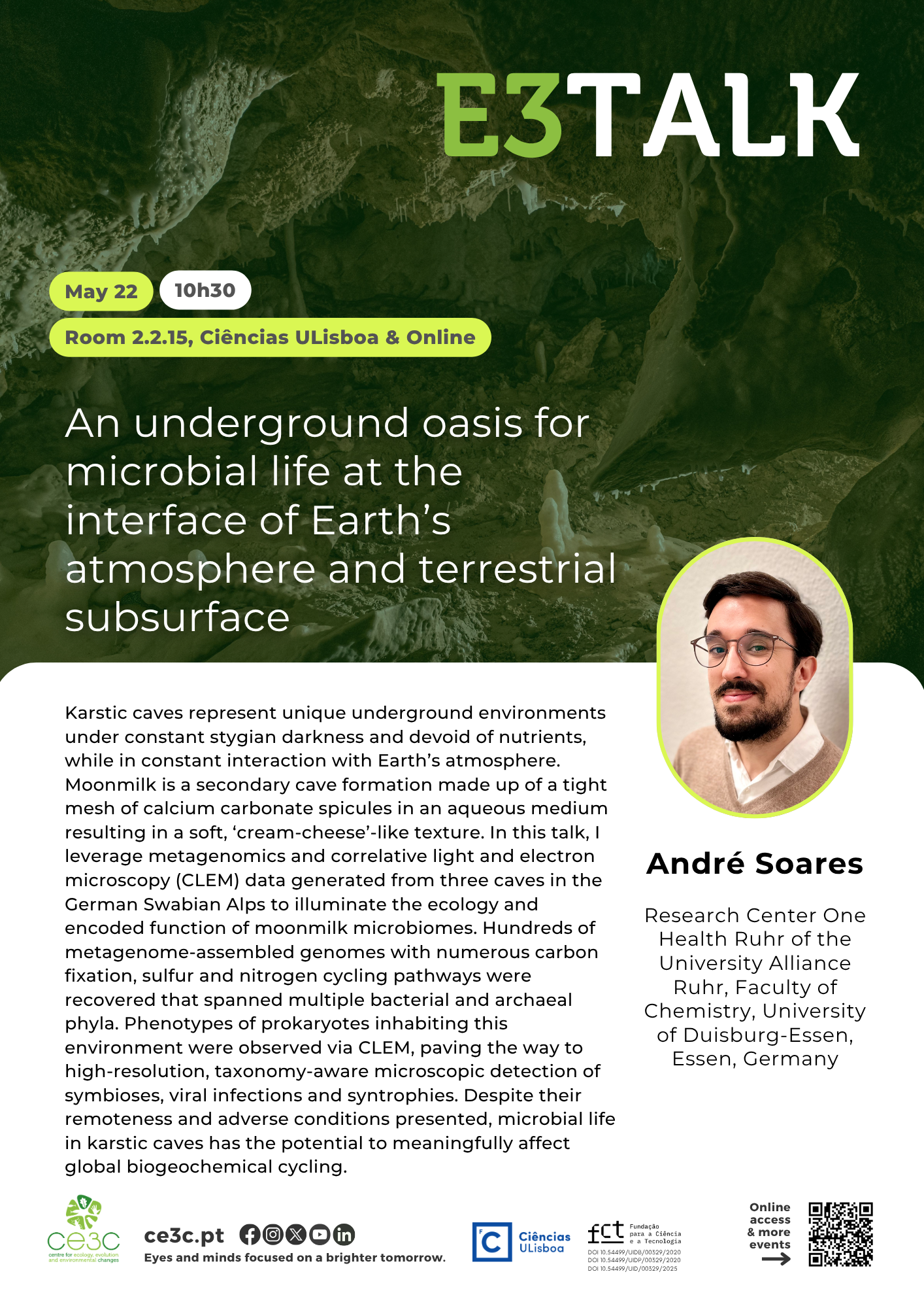Karstic caves represent unique underground environments under constant stygian darkness and devoid of nutrients, while in constant interaction with Earth’s atmosphere. Moonmilk is a secondary cave formation made up of a tight mesh of calcium carbonate spicules in an aqueous medium resulting in a soft, ‘cream-cheese’-like texture. In this talk, I leverage metagenomics and correlative light and electron microscopy (CLEM) data generated from three caves in the German Swabian Alps to illuminate the ecology and encoded function of moonmilk microbiomes. Hundreds of metagenome-assembled genomes with numerous carbon fixation, sulfur and nitrogen cycling pathways were recovered that spanned multiple bacterial and archaeal phyla. Phenotypes of prokaryotes inhabiting this environment were observed via CLEM, paving the way to high-resolution, taxonomy-aware microscopic detection of symbioses, viral infections and syntrophies. Despite their remoteness and adverse conditions presented, microbial life in karstic caves has the potential to meaningfully affect global biogeochemical cycling.