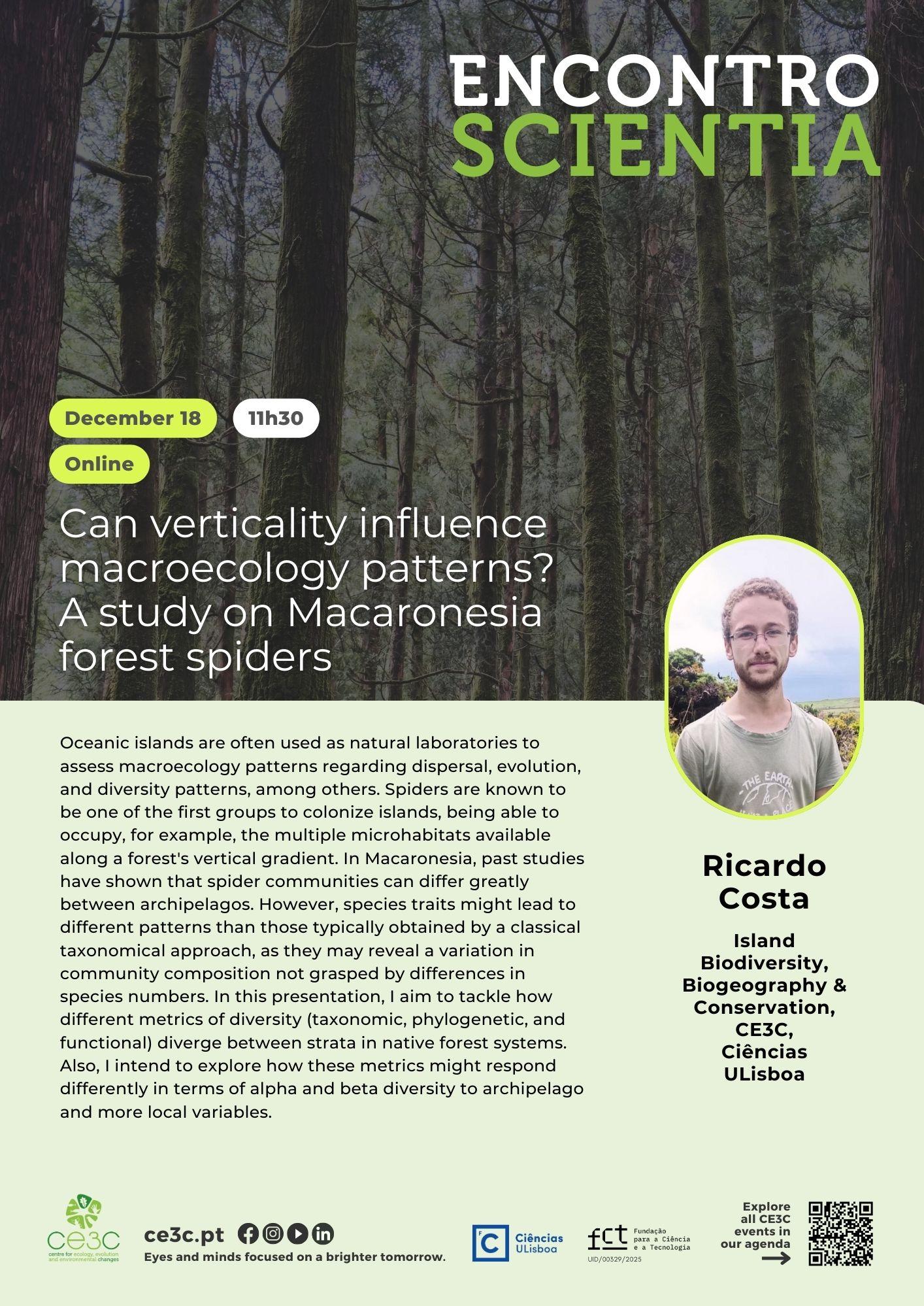 Oceanic islands are often used as natural laboratories to assess macroecology patterns regarding dispersal, evolution, and diversity patterns, among others. Spiders are known to be one of the first groups to colonize islands, being able to occupy, for example, the multiple microhabitats available along a forest's vertical gradient. In Macaronesia, past studies have shown that spider communities can differ greatly between archipelagos. However, species traits might lead to different patterns than those typically obtained by a classical taxonomical approach, as they may reveal a variation in community composition not grasped by differences in species numbers. In this presentation, I aim to tackle how different metrics of diversity (taxonomic, phylogenetic, and functional) diverge between strata in native forest systems. Also, I intend to explore how these metrics might respond differently in terms of alpha and beta diversity to archipelago and more local variables