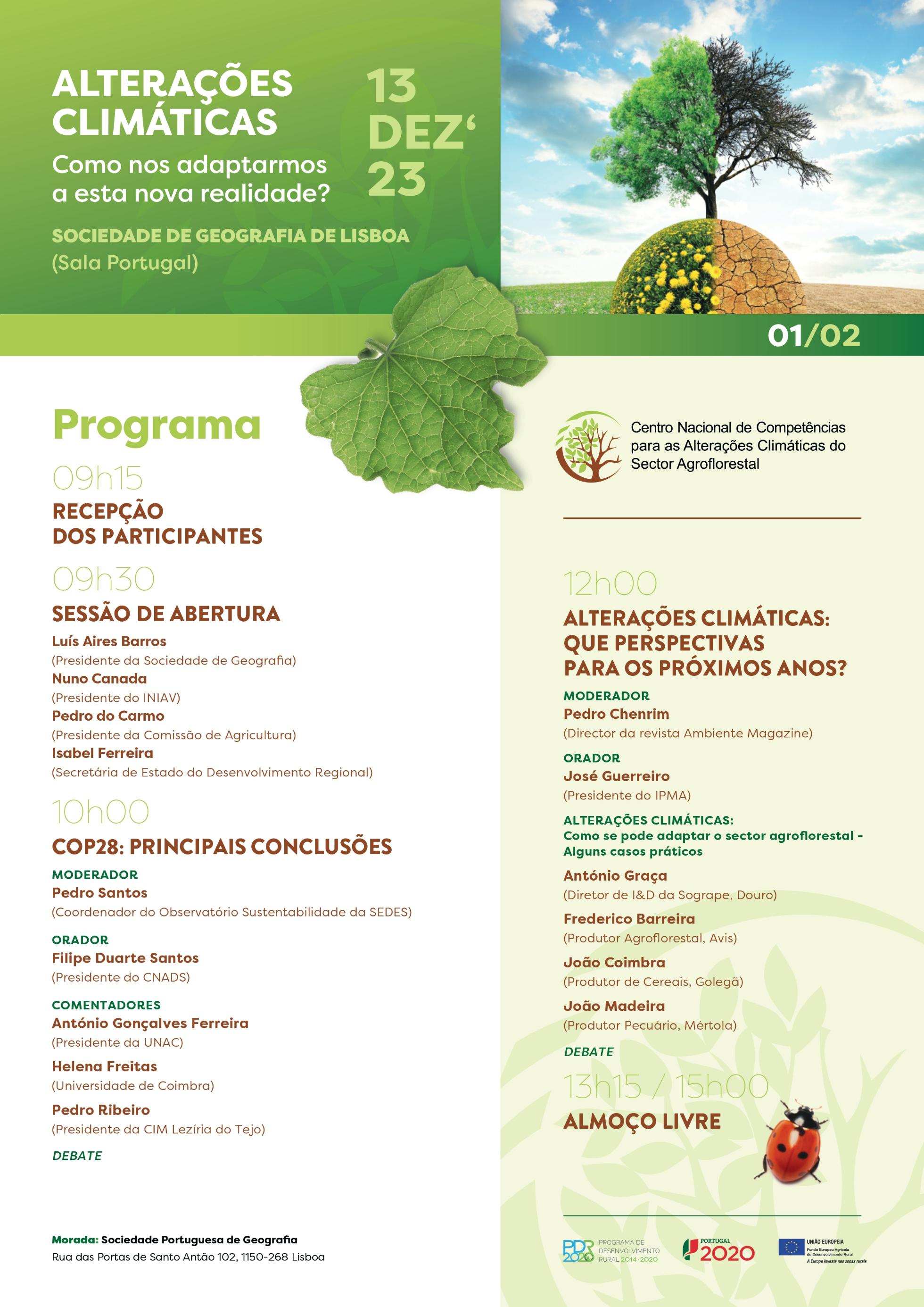 Decorreu no dia 13 de Dezembro de 2023, na Sociedade de Geografia de Lisboa, a Conferência “Alterações Climáticas: como nos adaptarmos a esta nova realidade?”. Organizada pelo Centro Nacional de Competências para as Alterações Climáticas do Sector Agroflorestal (CNCACSA). Foram feitas apresentações de resultados de vários projetos PRR, inclusive o AdaptForGrazing pela sua coordenadora, a Prof. Cristina Branquinho (Ciências ULisboa). A apresentação pode ser vista no vídeo abaixo, disponibilizado pela ANPROMIS, a partir do minuto 11:40.